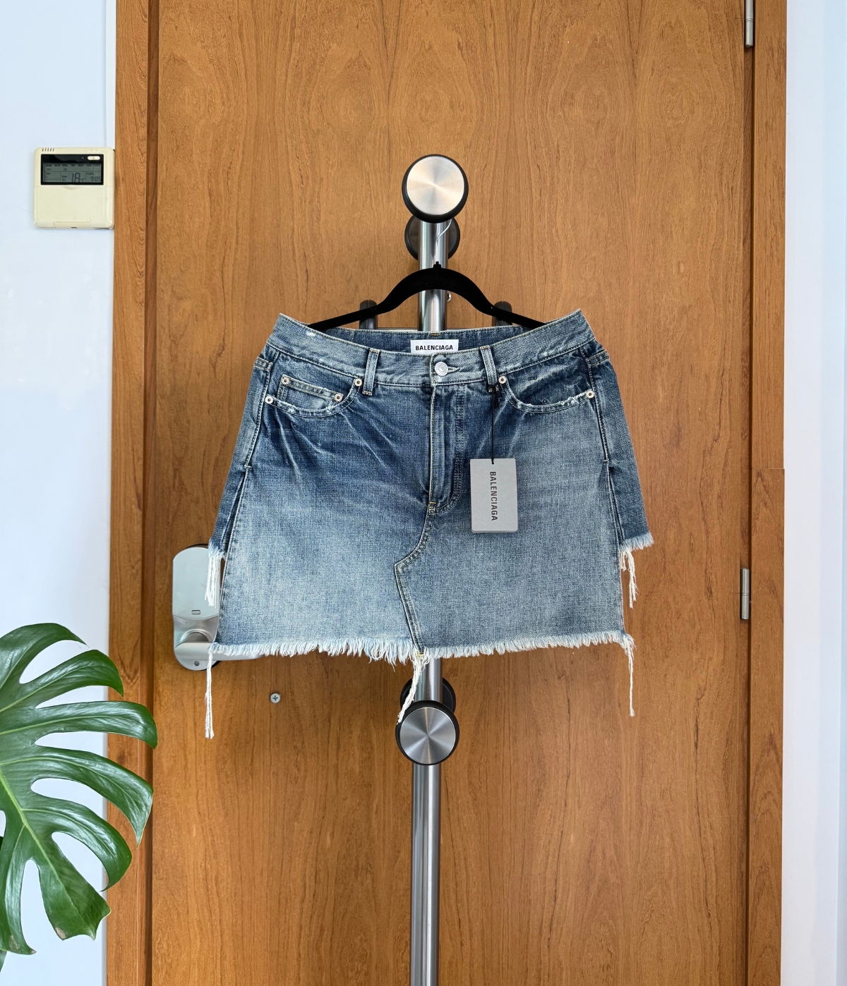 Minifalda de jean confeccionada en algodón 100%, con efecto trompe-l’œil que simula un short en la parte trasera y una falda en la delantera. Su diseño combina el ingenio visual característico de Balenciaga con un acabado desgastado que aporta actitud y modernidad Producto con etiqueta. Talle M