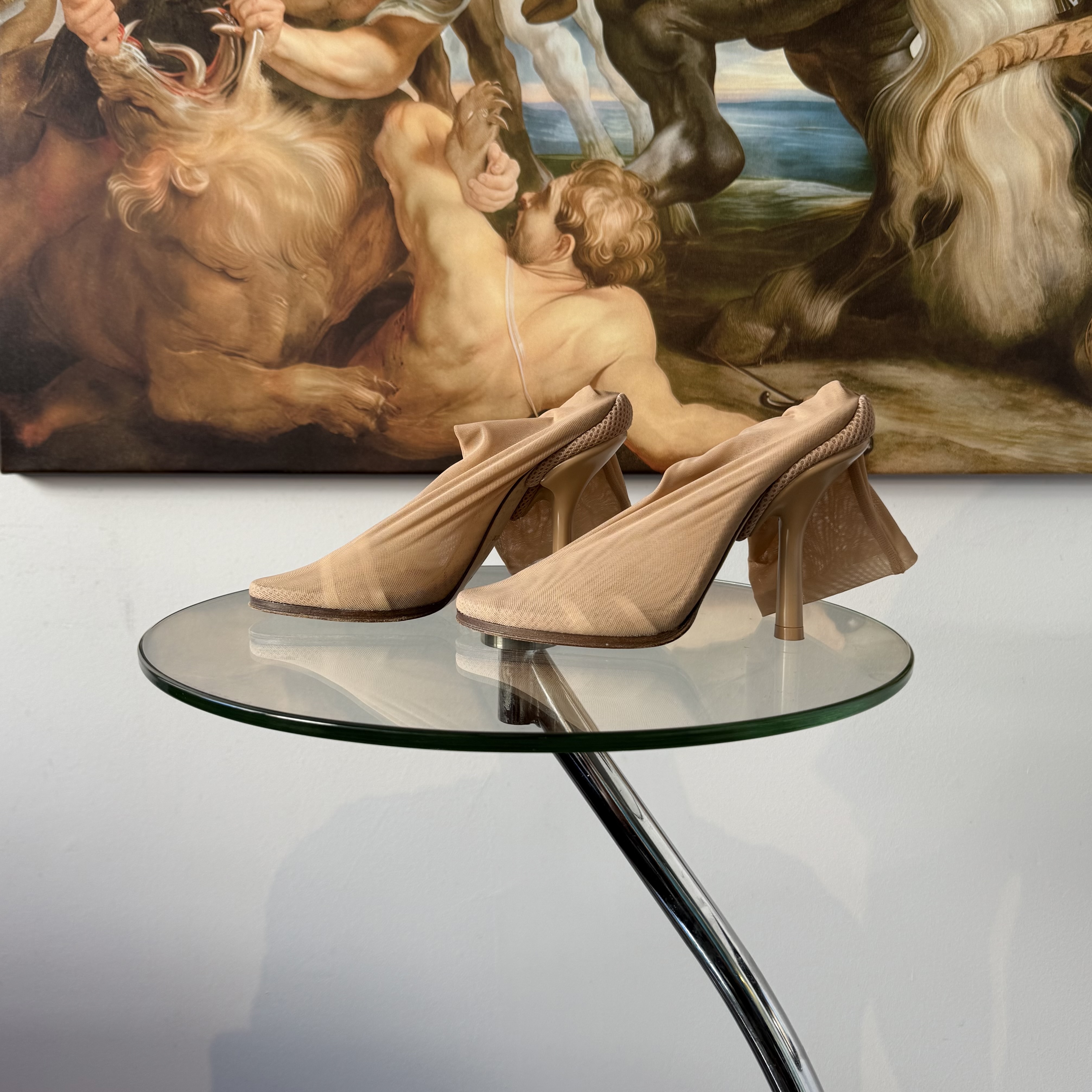 Construcción elástica de malla translúcida que envuelve el pie como segunda piel, montada sobre stiletto lacado en tono piel.