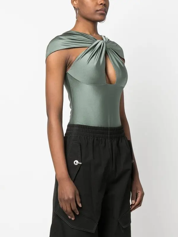 Body de Coperni confeccionado en jersey elástico con acabado satinado en tono verde metálico. Presenta escote asimétrico con drapeado y recorte central que realza la silueta. Una pieza moderna y estructural que combina sensualidad y precisión técnica. Con etiquetas. Talle XS/S